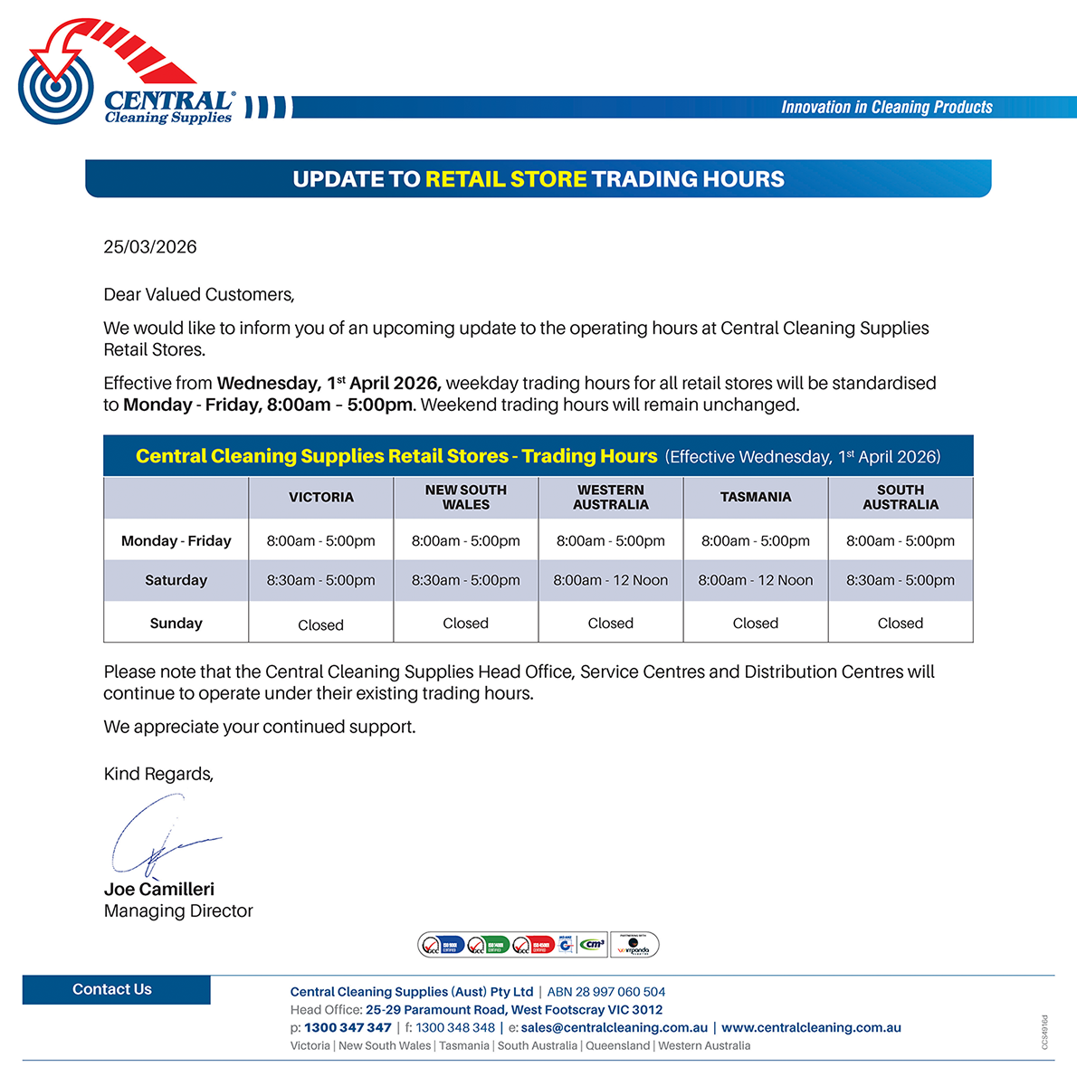Applies to Central Cleaning Supplies Retail Stores ONLY.